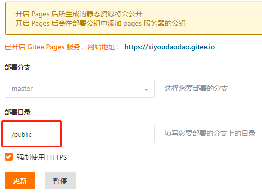 阿里云新用户优惠 使用Gitee Page创建个人博客 2020-09-27 · 17 words · 1 minute read 免费个人博客 实用教程 · 创建博客 新建仓库 创建仓库时可以选择不开源 仓库界面-服务-Gitee Pages 可以选择静态文件工具来创建博客页面 可以使用Jekyll、Hugo、Hexo 来快捷创建静态网页 上传生成好的html文件到仓库 到 仓库界面-服务-Gitee Pages 页面,选择部署分支、填写 部署目录 (Hugo生成的在/public), 填写后 点击 更新 关注微信公众号,与我交流吧~ 下一篇 laravel临时关闭created_at、updated_at的自动更新 上一篇 使用hugo快速生成个人博客
