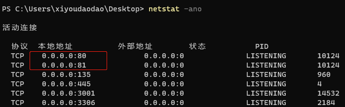 在结果中查找字符串netstat -ano查看netstat -ano|findstr 80 -