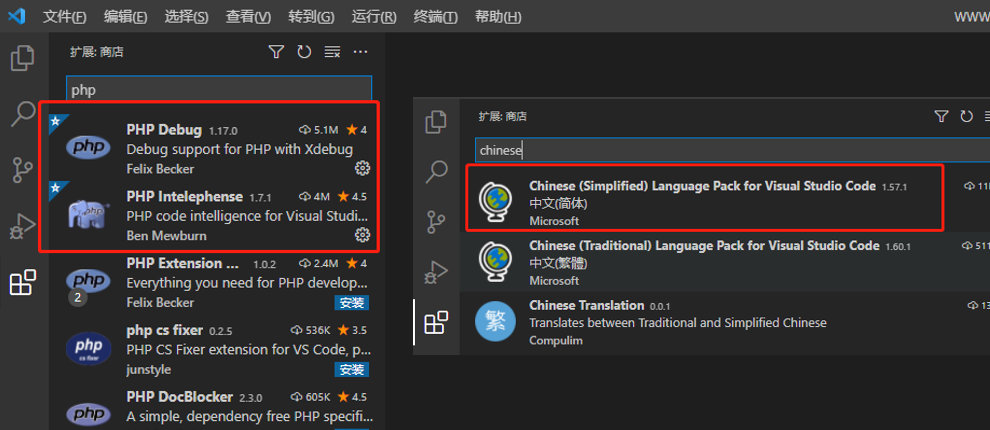 安装插件PHP Intelephense 和 Chinese(Simplified) Language Pack for Visual Studio Code