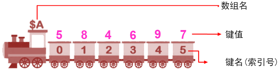 数组中的每一个数据称为数组的一个元素,每一个元素都由两部分组成:元素名与元素值。其中,元素名称为“键名”,元素值称为“键值”。数组元素的键名由程序员自定义。