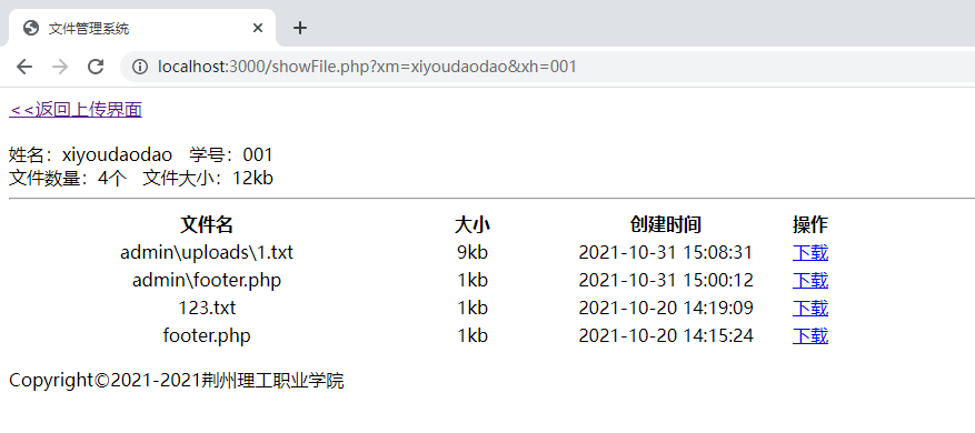 echo "<a href='showFile.php?xm={$xm}&xh={$xh}'>点击查看上传文件</a>";