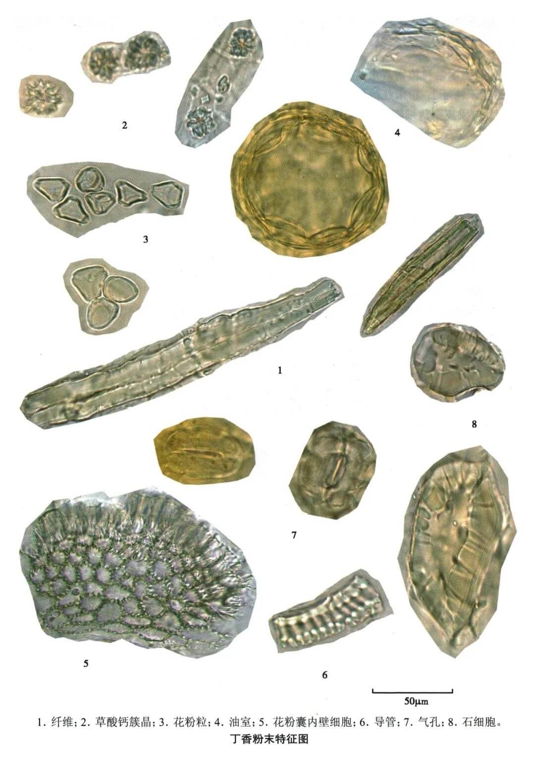 | 【显微鉴别】 粉末暗红棕色。纤维梭形,顶端钝圆,壁较厚。花粉粒众多,极面观三角形,赤道表面观双凸镜形,具3副合沟。草酸钙簇晶众多,直径4~26μm,存在于较小的薄壁细胞中。油室多破碎,分泌细胞界限不清,含黄色油状物。 |