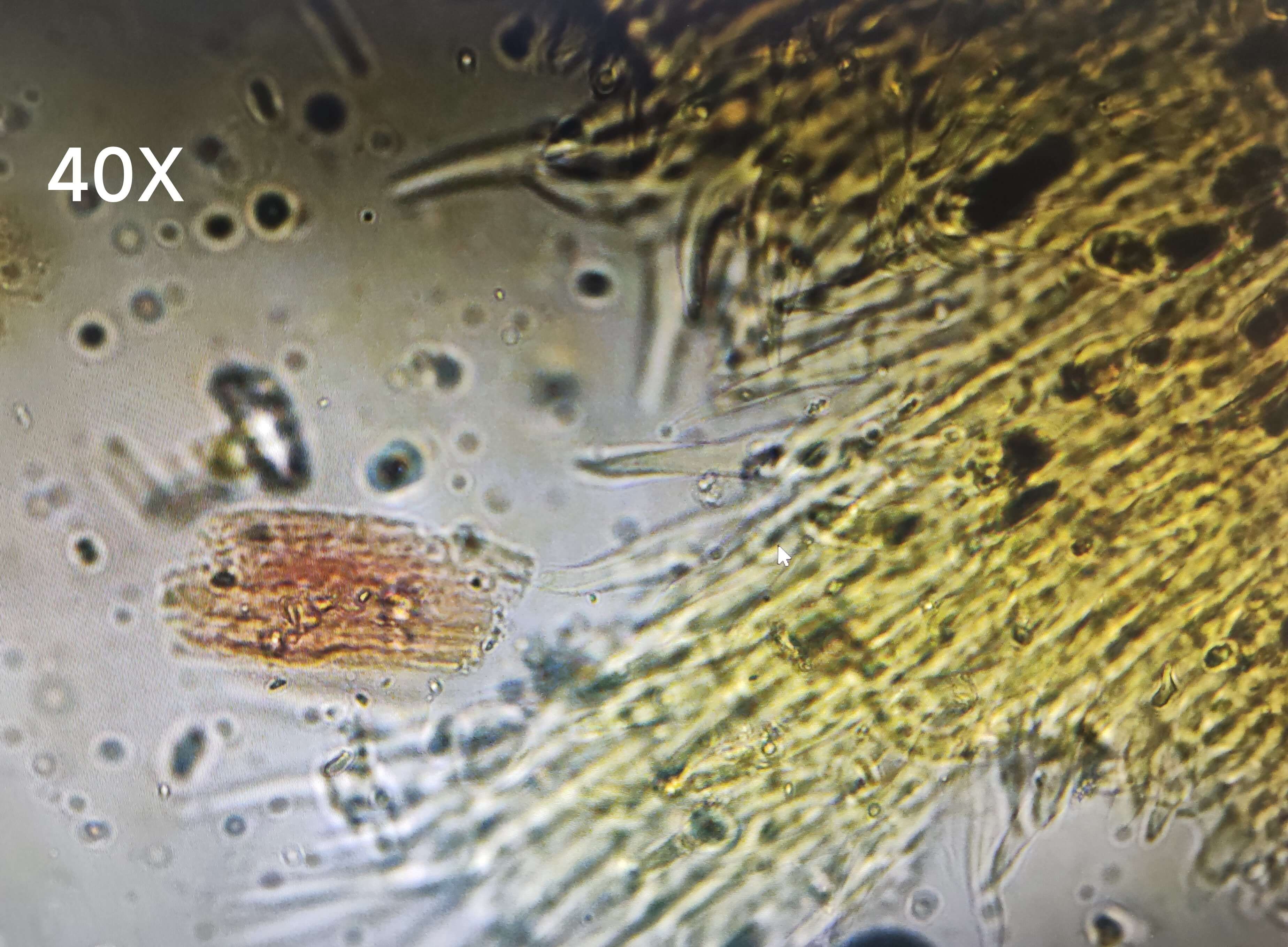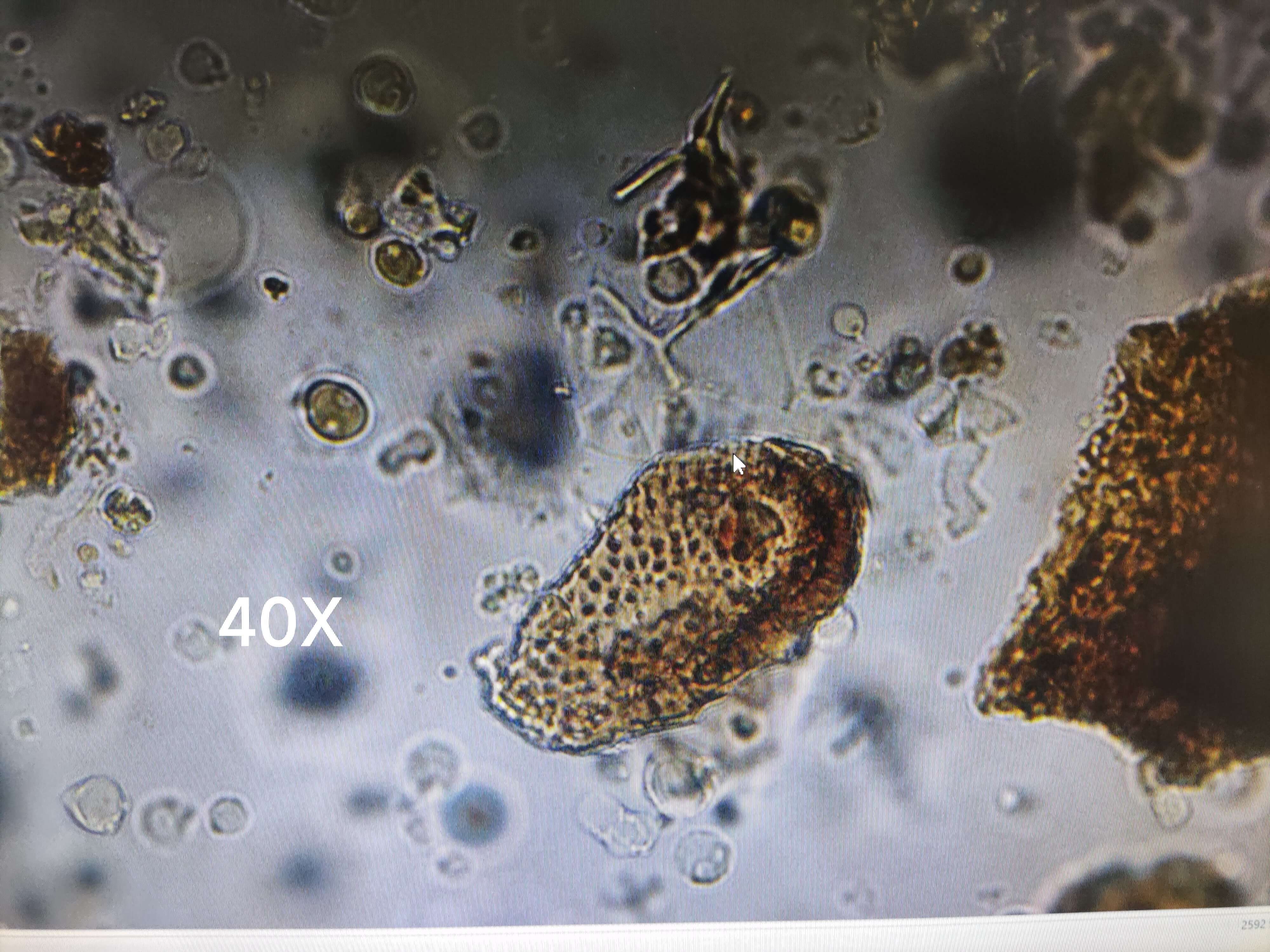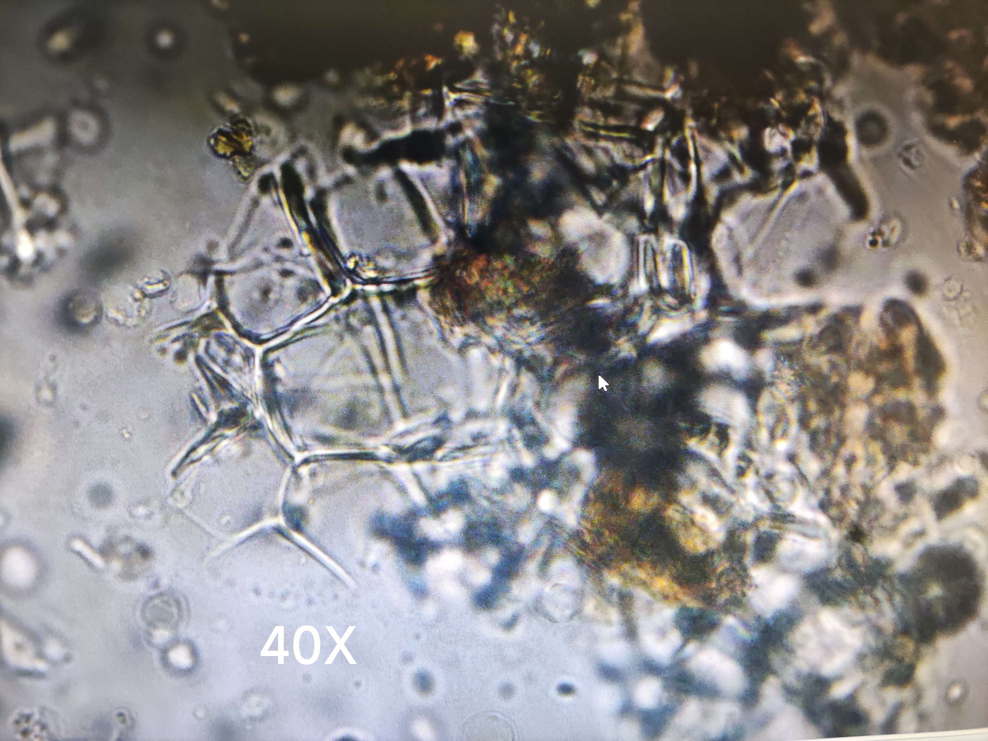 | 【显微重点】 菌丝团块、菌丝。5%氢氧化钾液装片才能将菌丝团块溶解,此后才能看到菌丝。 |