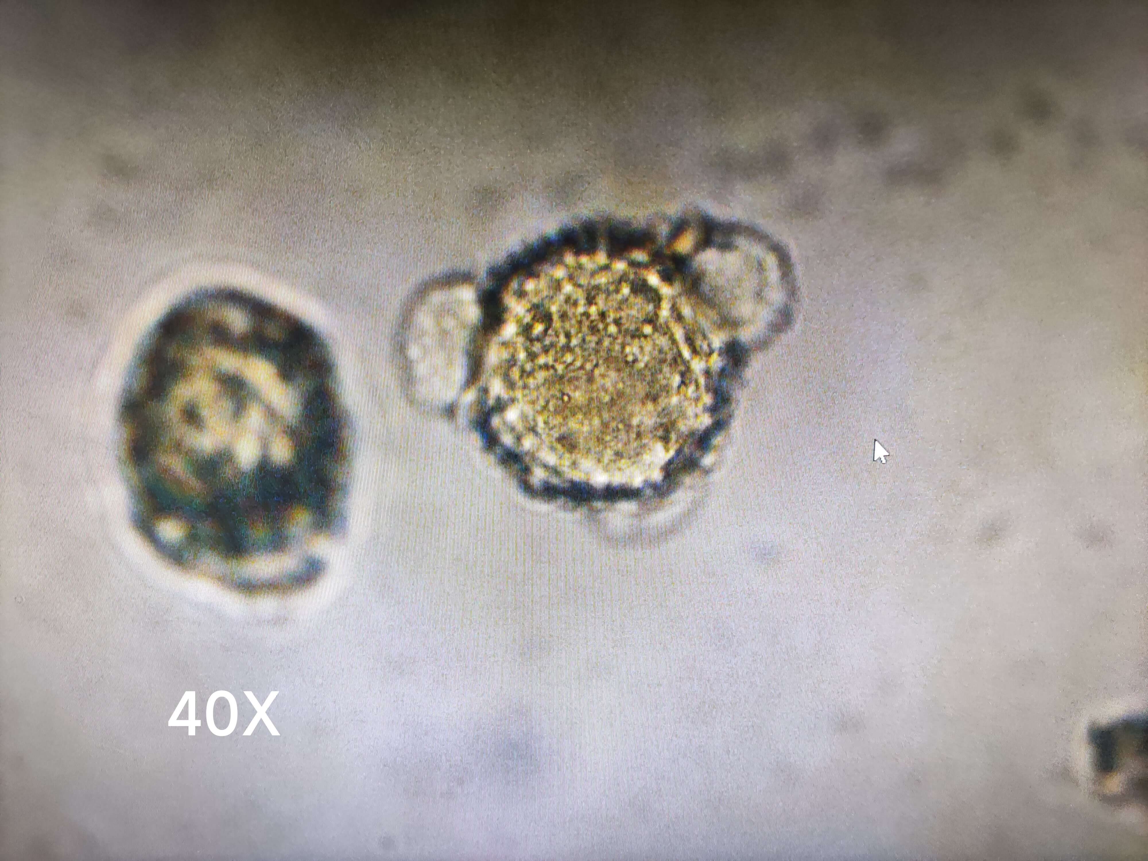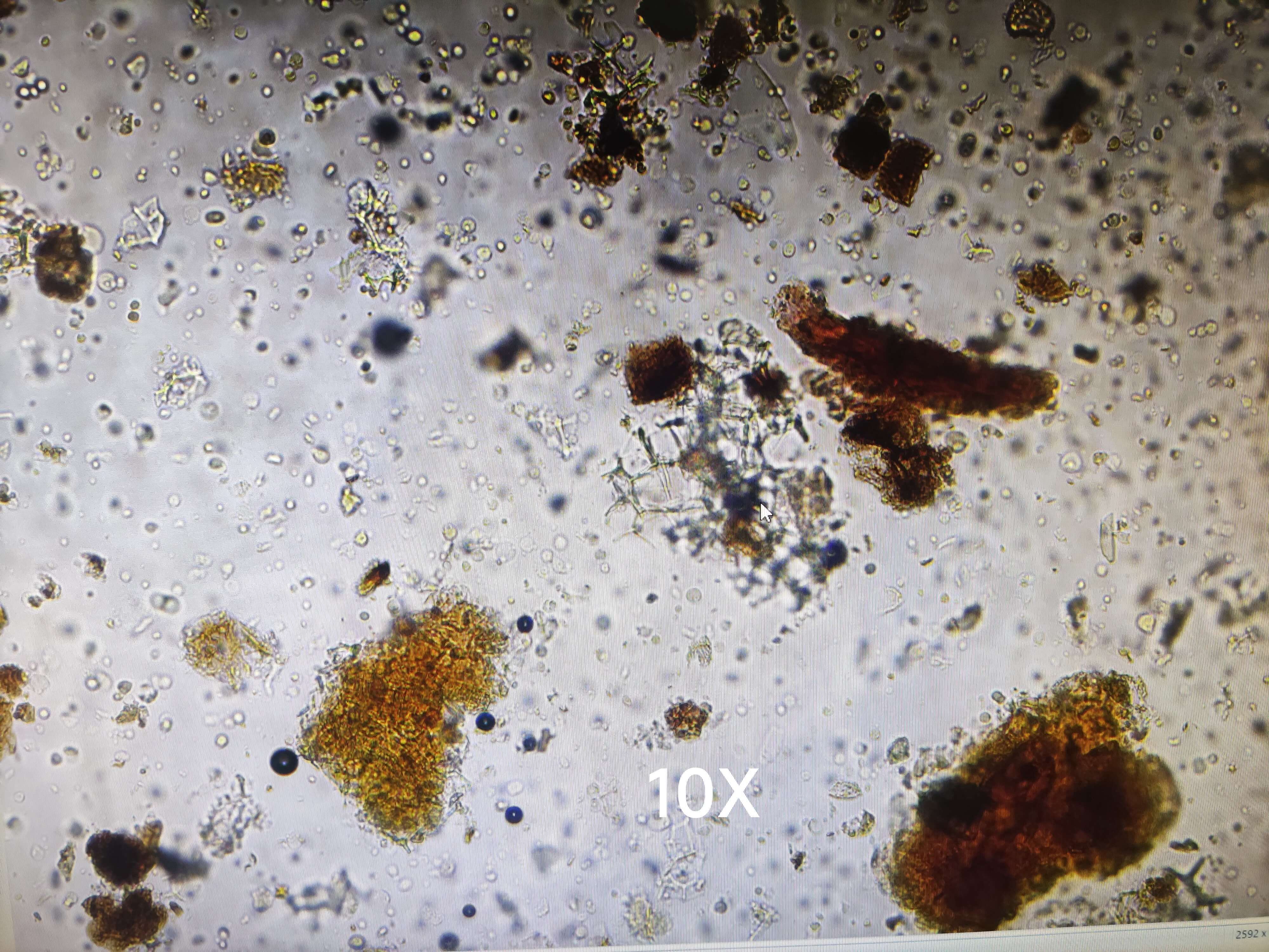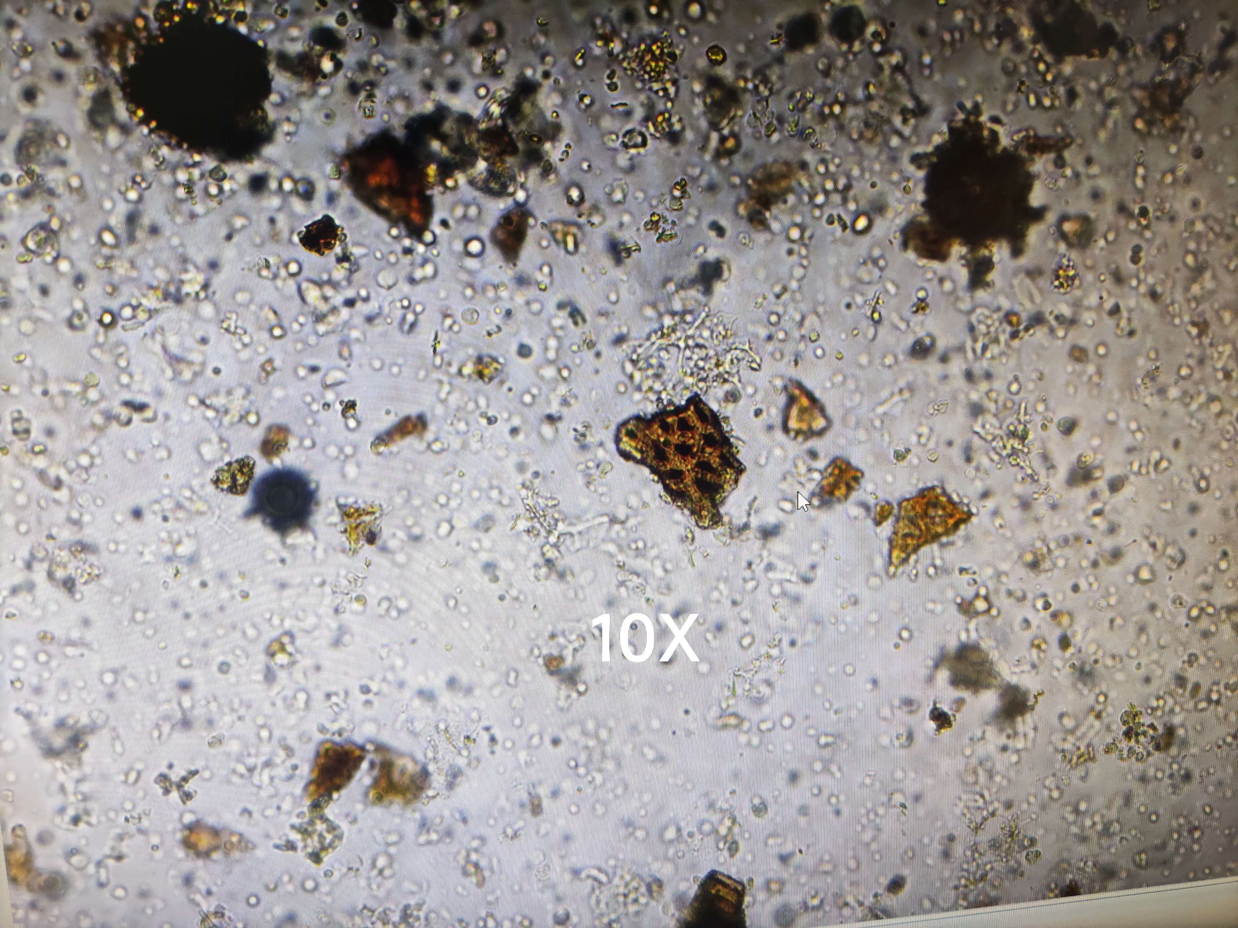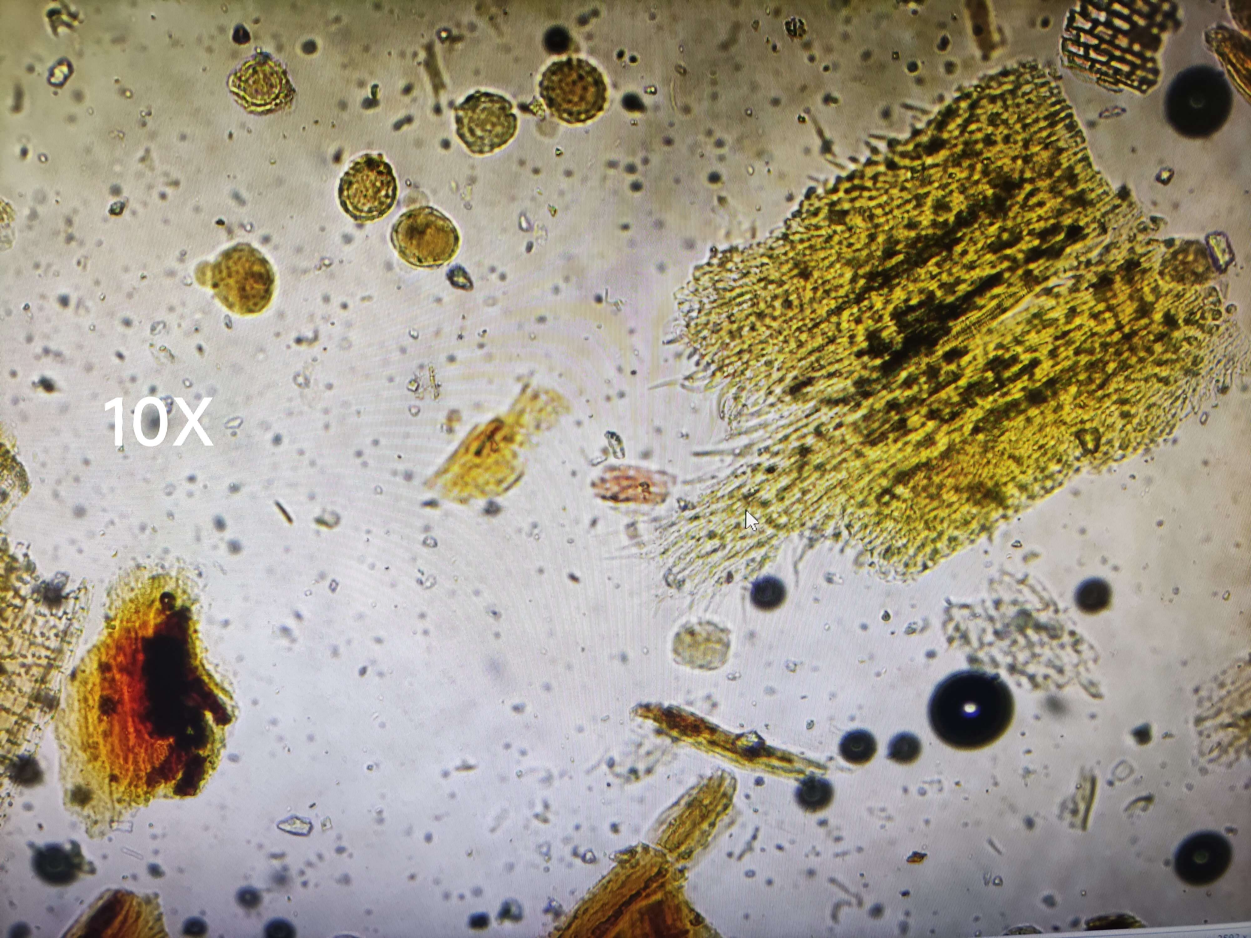 | 【显微重点】 菌丝团块、菌丝。5%氢氧化钾液装片才能将菌丝团块溶解,此后才能看到菌丝。 |