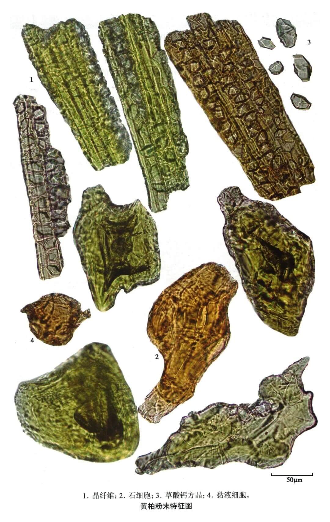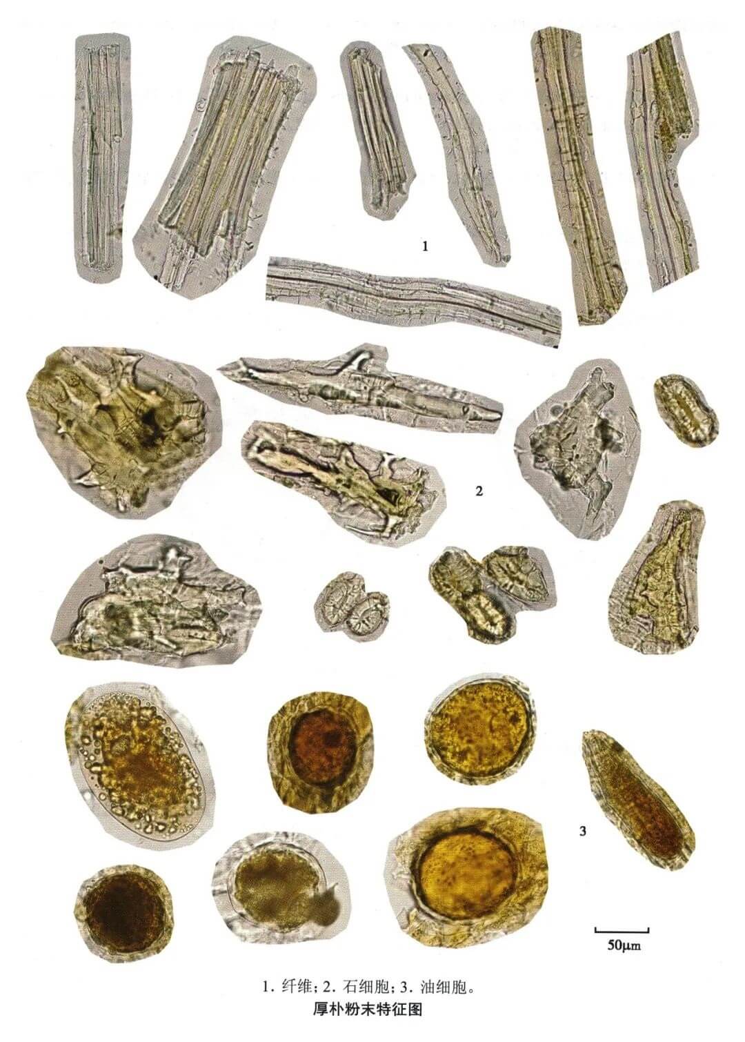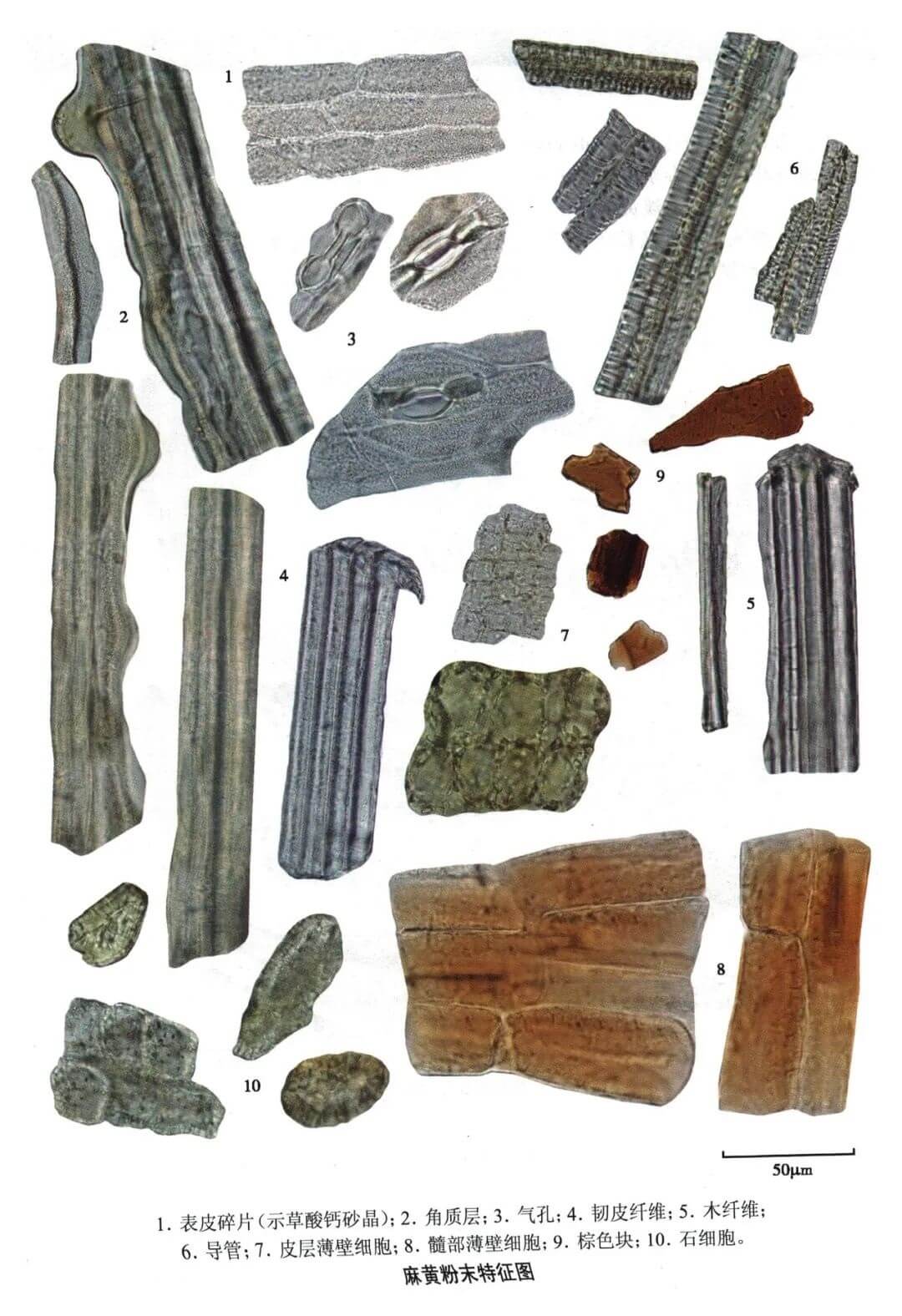 | 【显微重点】 鲜黄色纤维、晶纤维、石细胞。粘液细胞需要用水合氯醛不加热才容易找到。 |