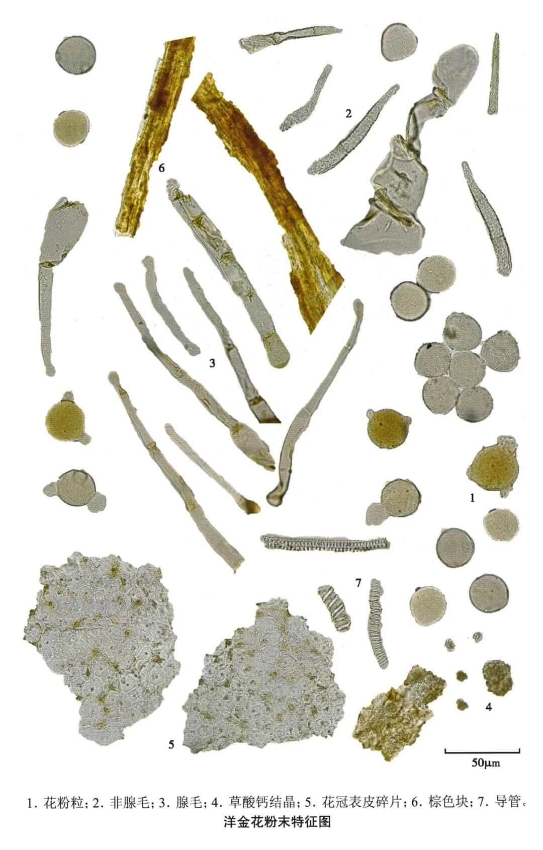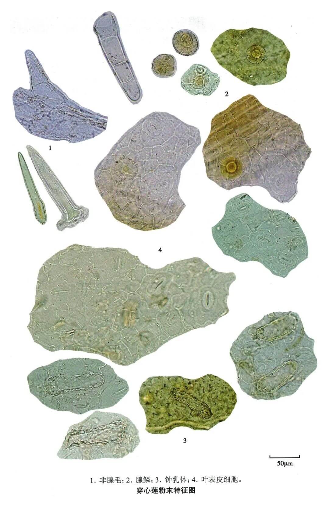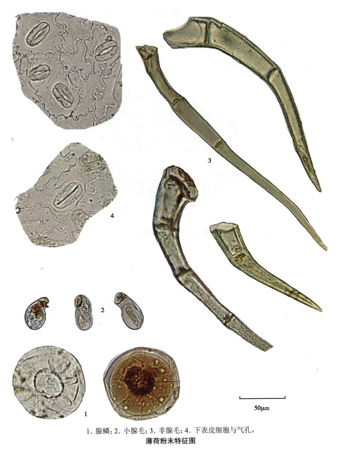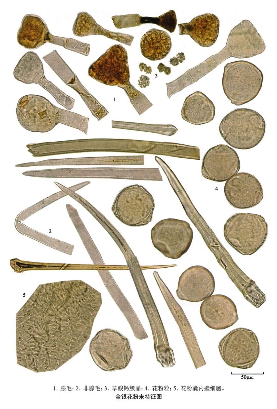 | 【显微重点】 花粉粒、2种非腺毛及2种腺毛。 |