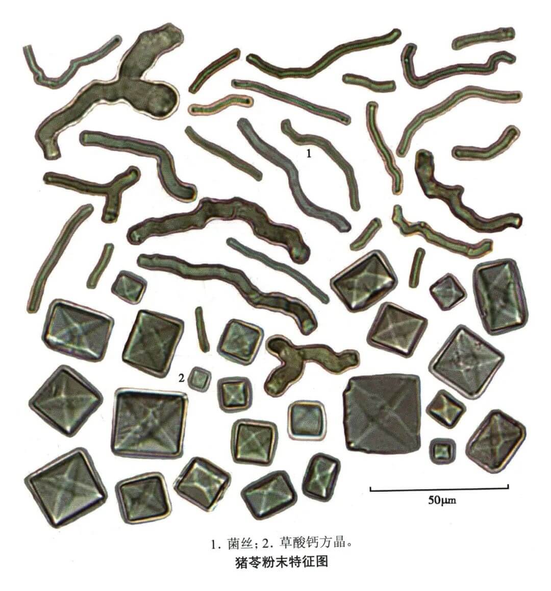 | 【显微重点】 草酸钙结晶、菌丝。 |