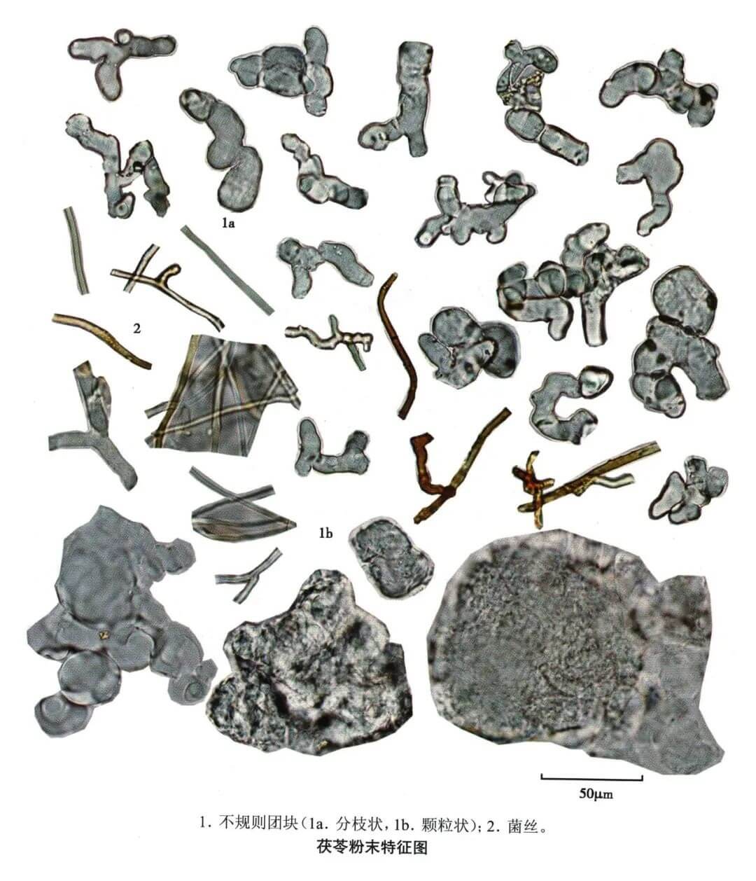 | 【显微鉴别】 粉末灰白色。用水或稀甘油装片,可见无色不规则颗粒状团块或末端钝圆的分枝状团块;5%氢氧化钾液装片,则团块溶化露出菌丝。菌丝细长,稍弯曲,有分枝,无色或带棕色(外层菌丝),直径3~8μm,稀至16μm,横壁偶可察见。 |
