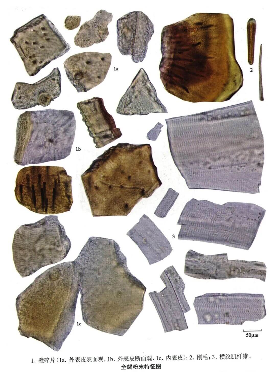 | 【显微鉴别】 本品粉末黄棕色或淡棕色。体壁碎片外表皮表面观呈多角形网格样纹理,表面密布细小颗粒,可见毛窝、细小圆孔和淡棕色或近无色的瘤状突起;内表皮无色,有横向条纹,内、外表皮纵贯较多长短不一的微细孔道。刚毛红棕色,多碎断,先端锐尖或钝圆,具纵直纹理,髓腔细窄。横纹肌纤维多碎断,明带较暗带宽,明带中有一暗线,暗带有致密的短纵纹理。 |