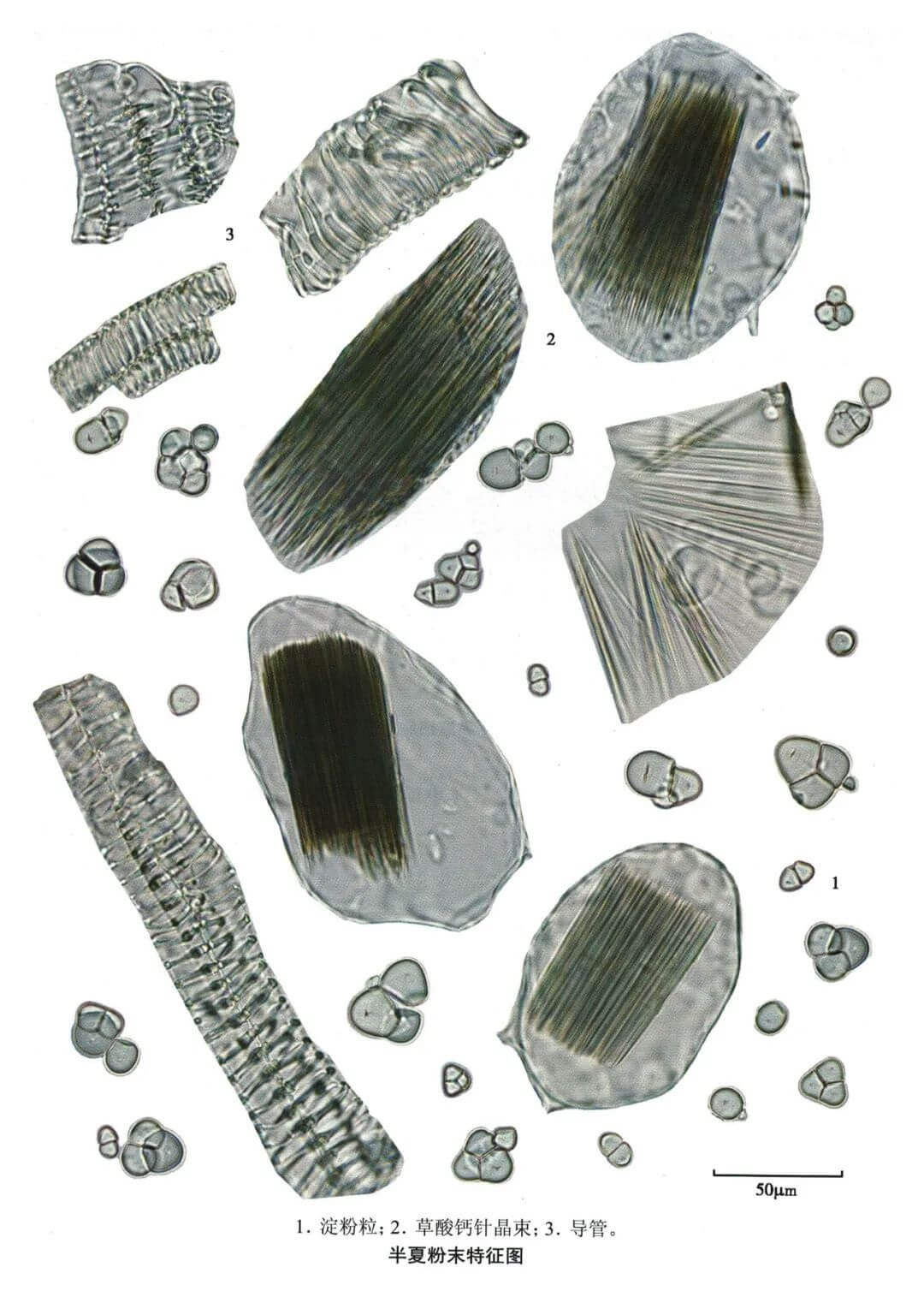 | 【显微鉴别】 本品粉末类白色。淀粉粒甚多,单粒类圆形、半圆形或圆多角形,直径2~20μm,脐点裂缝状、人字状或星状;复粒由2~6分粒组成。草酸钙针晶束存在于椭圆形黏液细胞中,或随处散在,针晶长20~144μm。螺纹导管直径10~24μm。 |