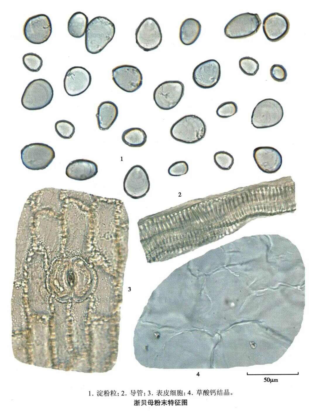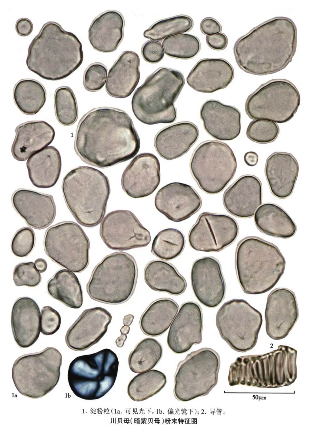 | 炉贝 淀粉粒广卵形、贝壳形、肾形或椭圆形,直径约至60μm,脐点人字状、星状或点状,层纹明显。螺纹导管和网纹导管直径可达64μm。 |