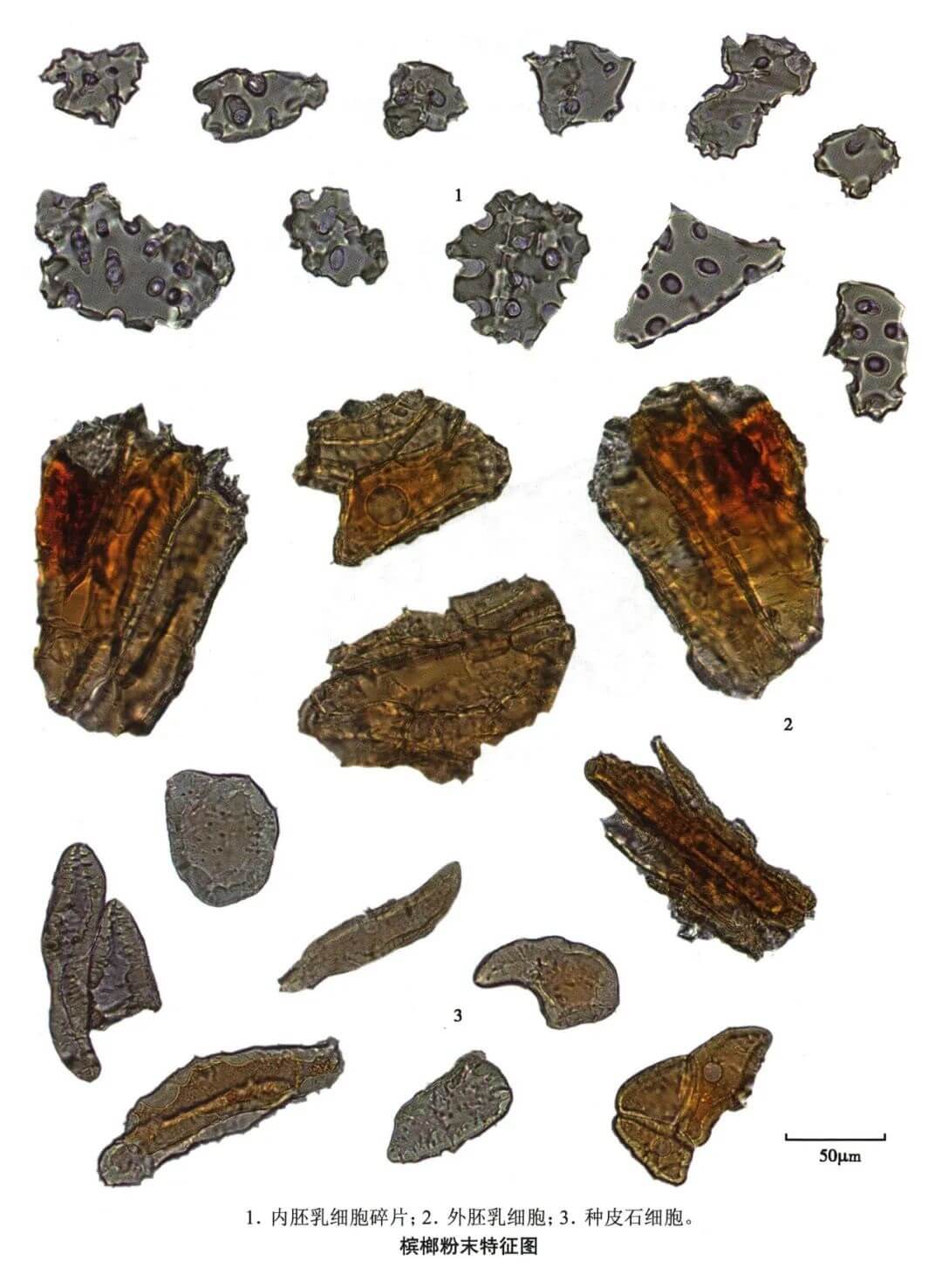 | 【显微鉴别】 粉末红棕色至淡棕色。内胚乳碎片近无色,细胞呈多角形或类方形,壁厚6~11μm,有类圆形大纹孔。种皮石细胞纺锤形、长方形或多角形,直径24~64μm,壁不甚厚。外胚乳细胞长方形、类多角形,内含红棕色或深棕色物。 |