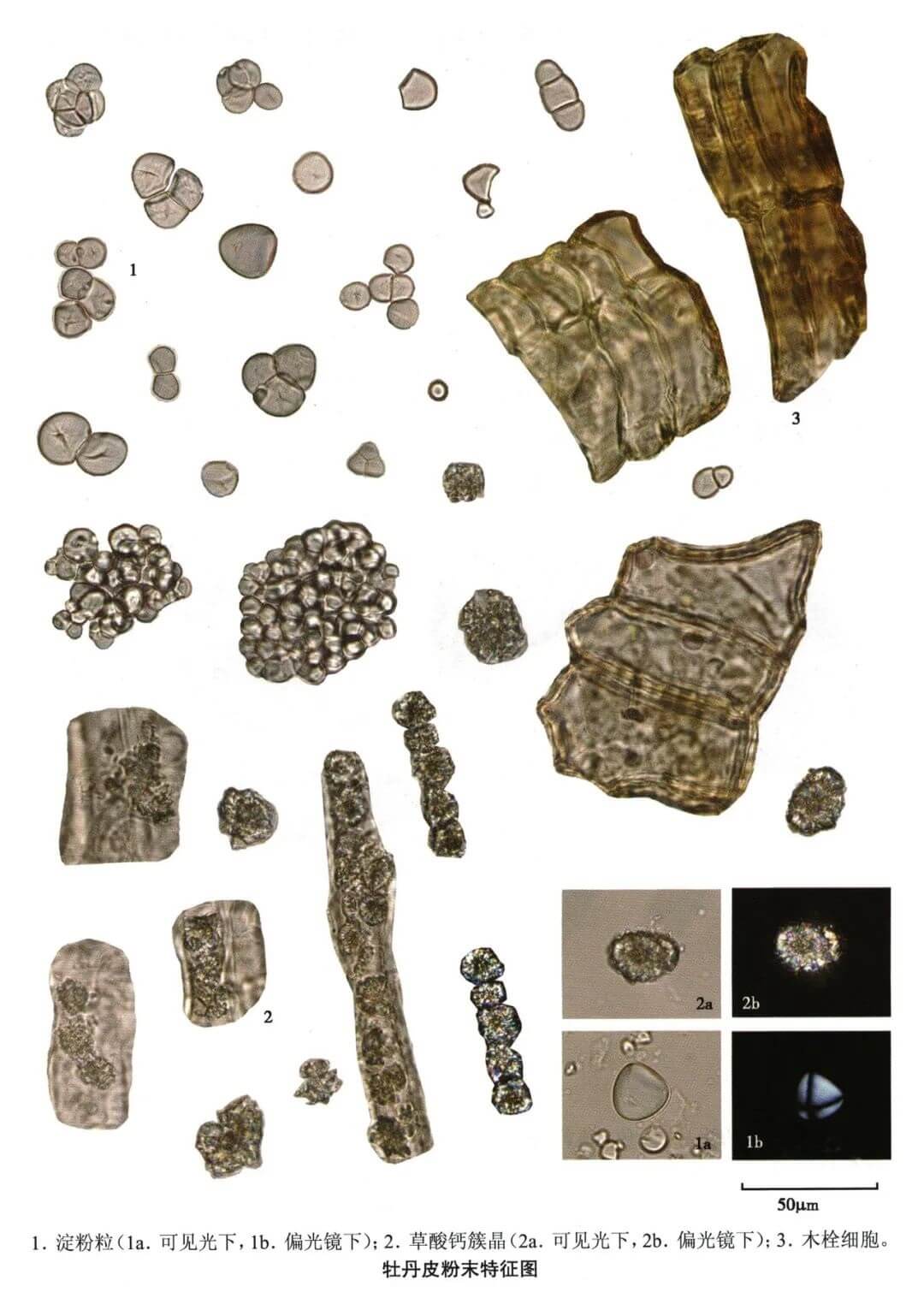 | 【显微鉴别】 本品粉末淡红棕色。淀粉粒甚多,单粒类圆形或多角形,直径3~16μm,脐点点状、裂缝状或飞鸟状;复粒由2~6分粒组成。草酸钙簇晶直径9~45μm,有时含晶细胞连接,簇晶排列成行,或一个细胞含数个簇晶。连丹皮可见木栓细胞长方形,壁稍厚,浅红色。 |