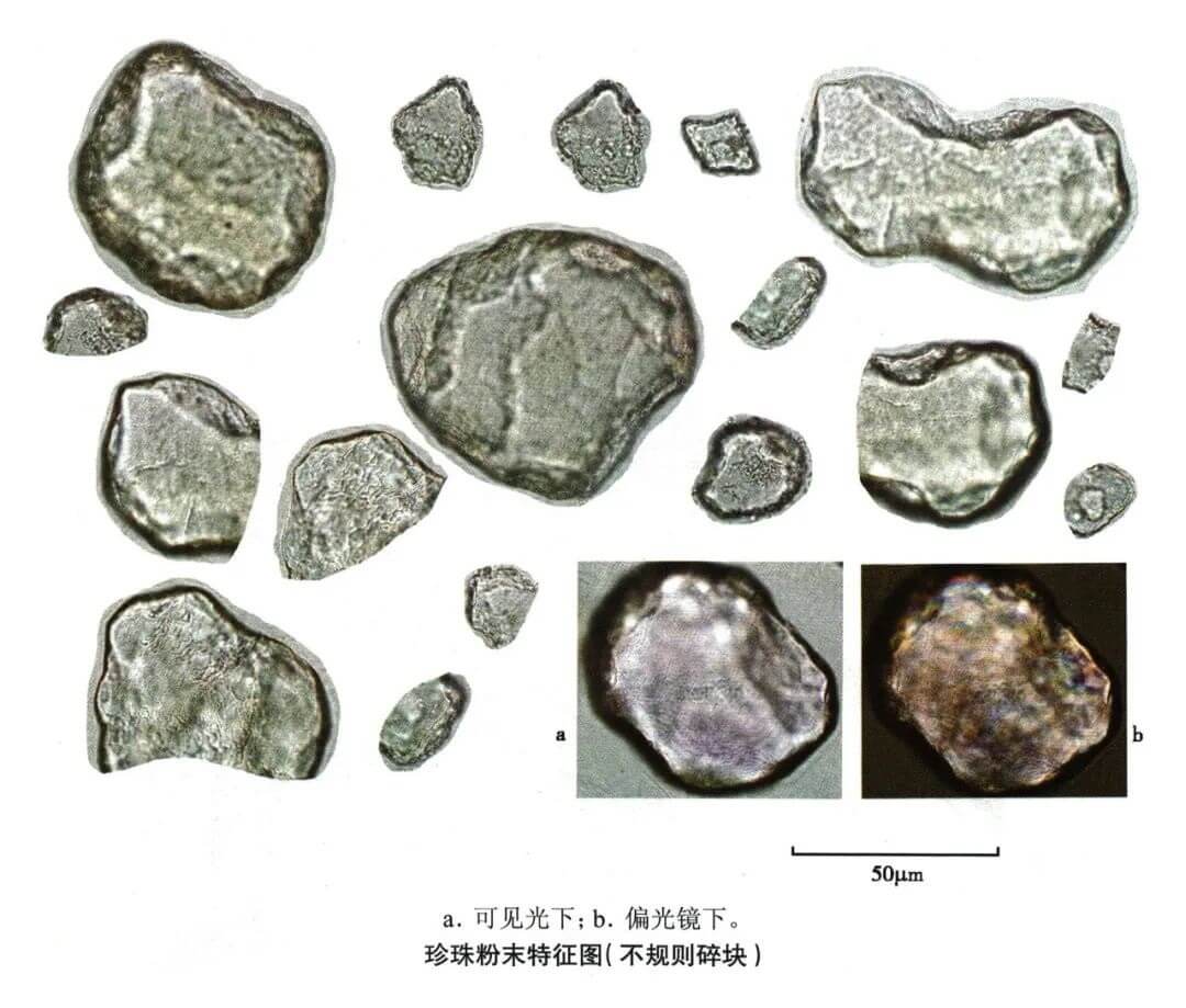 | 【显微鉴别】 本品粉末类白色。不规则碎块,半透明,具彩虹样光泽。表面显颗粒性,由数至十数薄层重叠,片层结构排列紧密,可见致密的成层线条或极细密的微波状纹理。 |