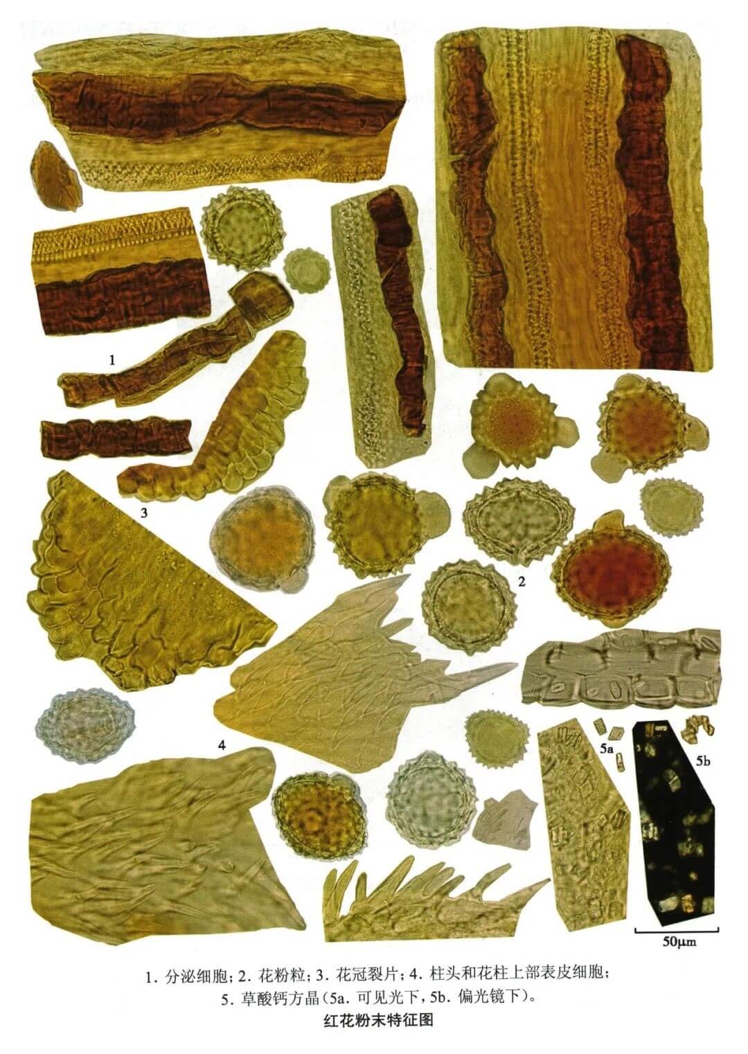 | 【显微鉴别】 本品粉末橙黄色。花冠、花丝、柱头碎片多见,有长管状分泌细胞常位于导管旁,直径约至66μm,含黄棕色至红棕色分泌物。花冠裂片顶端表皮细胞外壁突起呈短绒毛状。柱头和花柱上部表皮细胞分化成圆锥形单细胞毛,先端尖或稍钝。花粉粒类圆形、椭圆形或橄榄形,直径约至60μm,具3个萌发孔,外壁有齿状突起。草酸钙方晶存在于薄壁细胞中,直径2~6μm。 |